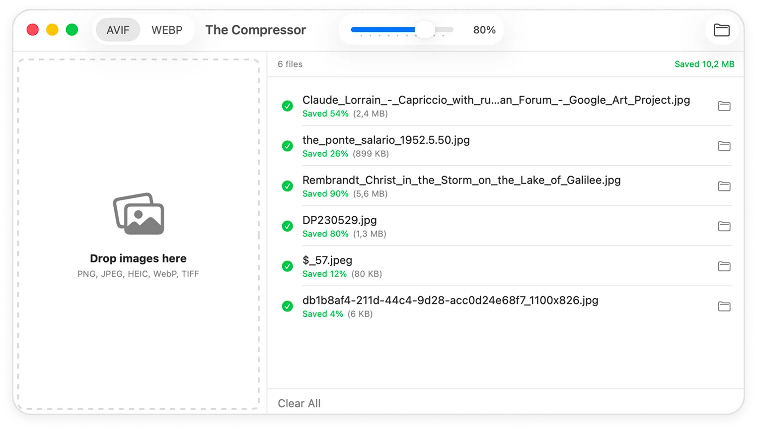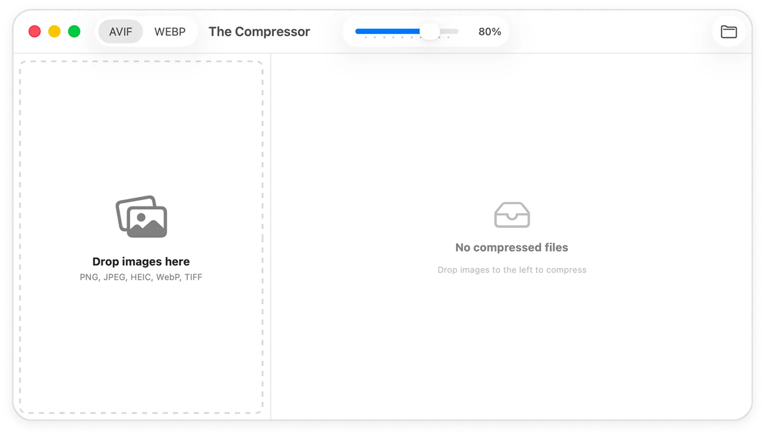 The Compressor transforms your images into AVIF and WebP formats in seconds. Built for developers and designers who need speed, it runs entirely on your Mac - drag, drop, done. Converted files automatically organize on your desktop, ready to deploy. No cloud processing. No accounts. No limits.